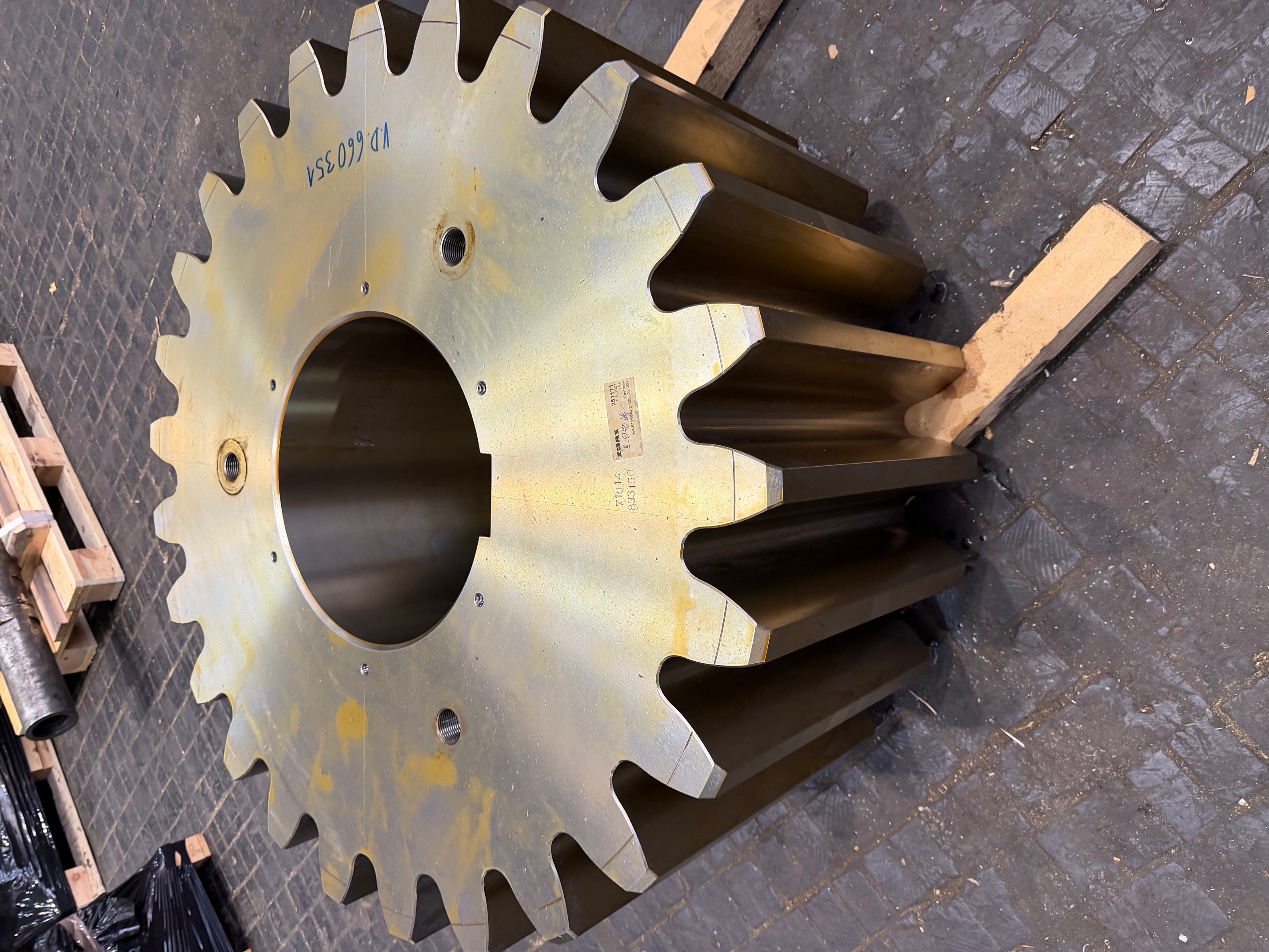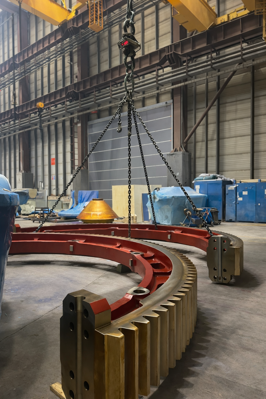 - nový odlévaný ozubený věnec; z = 144; m = 42 mm (dělený na dvě poloviny, spojený systémem Superbolts),