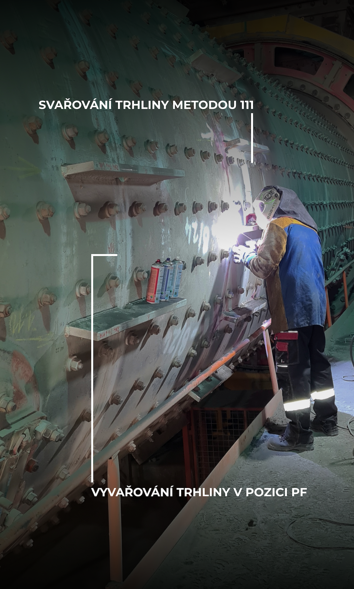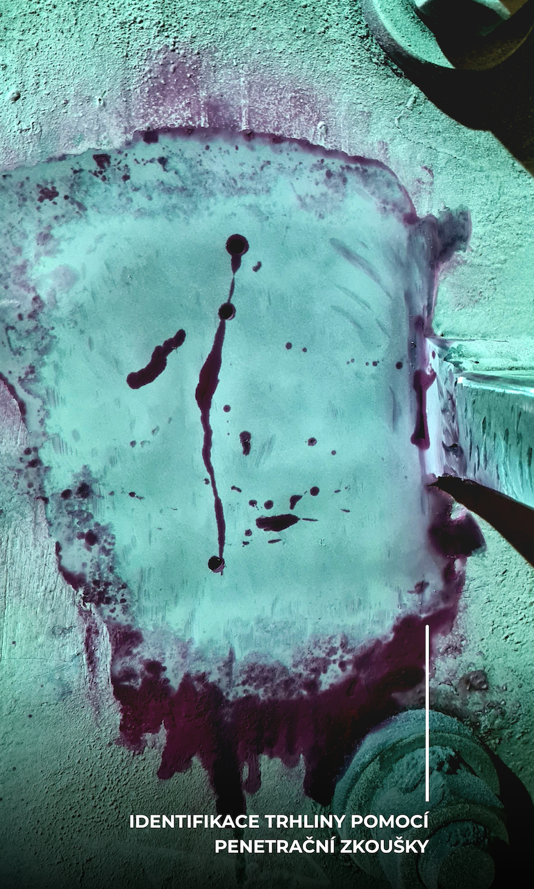 Po příjezdu na místo byly nejprve provedeny testy – vizuální, kapilární a ultrazvuková diagnostika, aby se zjistil rozsah poškození. Analýza ukázala, že trhliny nejsou jen povrchové, ale zasahují hluboko do nosné konstrukce. To znamenalo, že oprava nemohla být provedena pouze kosmeticky, ale vyžadovala speciální svařovací postup, sestavení týmu a harmonogramu opravy.